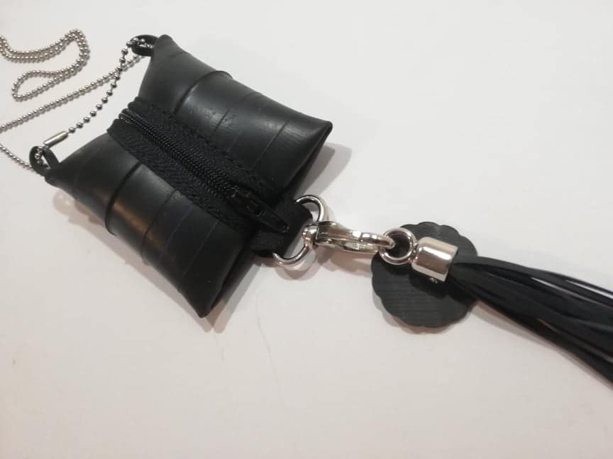 Ogrlica mini Olive je hibrid ogrlice, obeska za ključe in drobižnice za kovance.